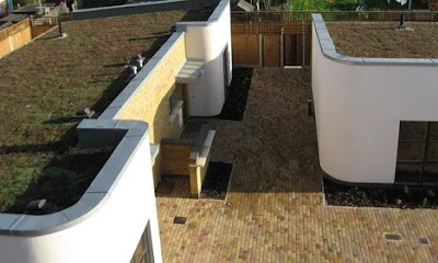Every building including a bio-diverse sedum roof and solar thermal collectors to pre-heat water. Wind turbines have also been incorporated, taking advantage of the development’s location away from a built-up urban area.