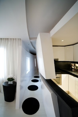 A sinuous hallway, which curves and shifts unexpectedly, creates a diagonal across the floorspace, dividing the private bedroom area from the living room and kitchen. A double-curving internal wall creates dramatic shadows, enhanced by lighting and implying further depth. The effect is of travelling through a much larger floor space.